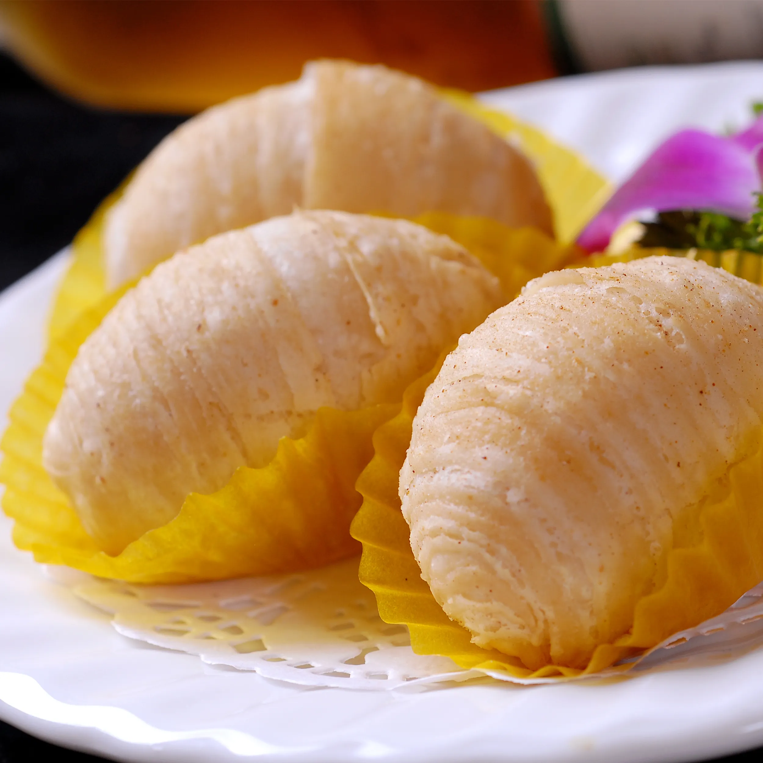 4、用剪刀将表面修平,在每只角上平行剪出2根小条,然后将第一根小条向上弯起,在尖端涂上蛋液,粘在5只角的中心,组成5个小环球,每只角的第二根小条表示花瓣,另在5只角的2/5处垂直剪一刀,即成生坯,然后将生坯下入油锅中炸至酥纹绽开、色泽洁白、不含油时捞出,花心处放上半粒红樱桃即可。