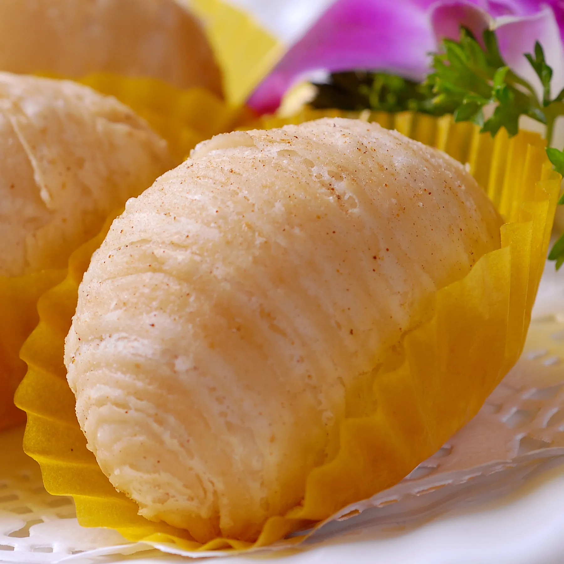 将油锅放入色拉油,加热至90℃,下入生坯(收口向下),稍静置后逐渐升温至150℃,炸至制品上浮、色泽微黄、层次清晰、体积膨大即可出锅,沥油装盘。