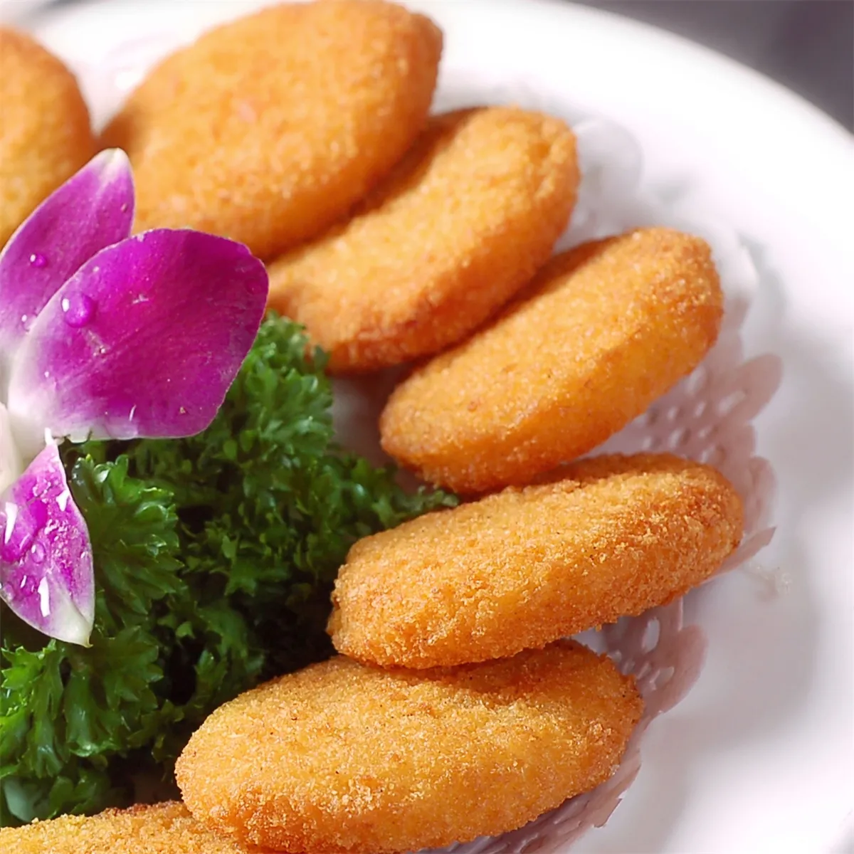 将油锅放入油,加热至90℃, 下入生坯(收口向下),静置后逐渐升温150℃,不断翻面,呈金黄色捞出,装盘。也可用面火200℃、底火为220℃的烤箱中烤约10min,烤制成熟。