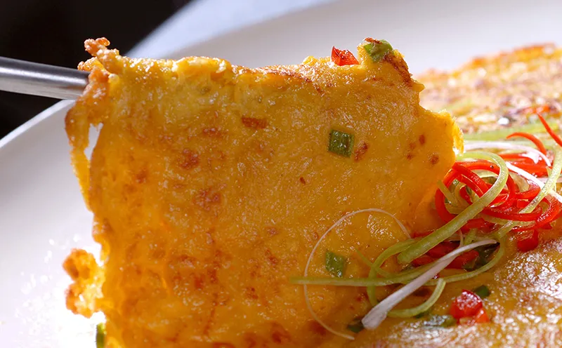 3、平底锅内刷油烧热,放入饼坯,用小火反复烙熟,取出装盘即成。