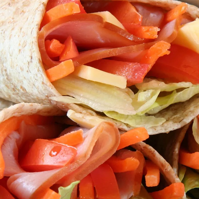 3、取筋饼皮摊平,铺上生菜叶后,取适量炒好的馅料放入饼中,再将饼卷起即可。