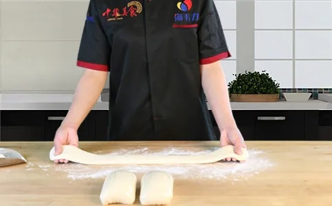 说明:和面要求和成表面光滑的面团,一般要求“三光”,即盆光、手光、面光。