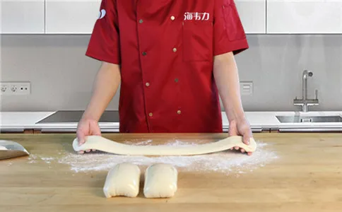3、把醒发好面团拉成长条,擀成面片,切成相同的条形,把两个面片叠在一起,用刀背在面片中间压一下,捏着两头拉成一定的长条。
